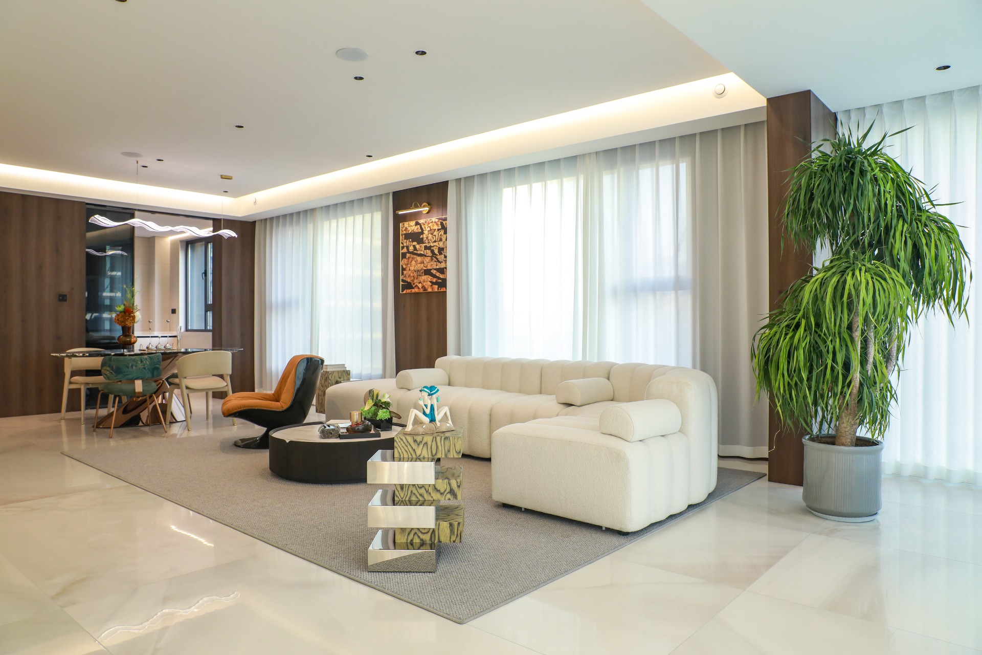 单元精装入户大堂空间开阔、材质考究,配备智能无感通行系统,提升居住便捷度与安全感;地下车库以星空穹顶灯光、金属格栅艺术吊顶、干挂铝板景墙、高端水磨石材质,打造出如“奢华艺术长廊”般的归家动线,让每一次出入都成为享受。