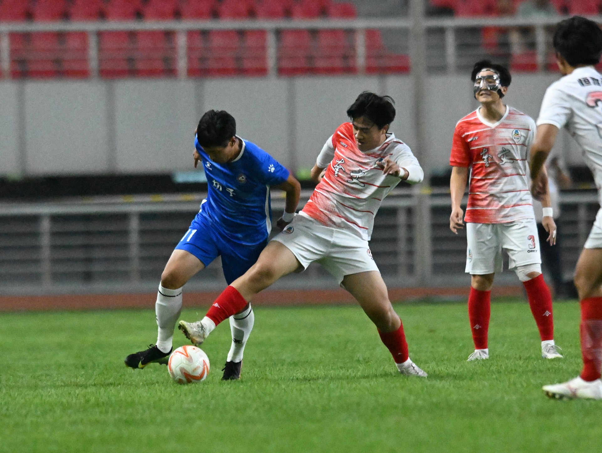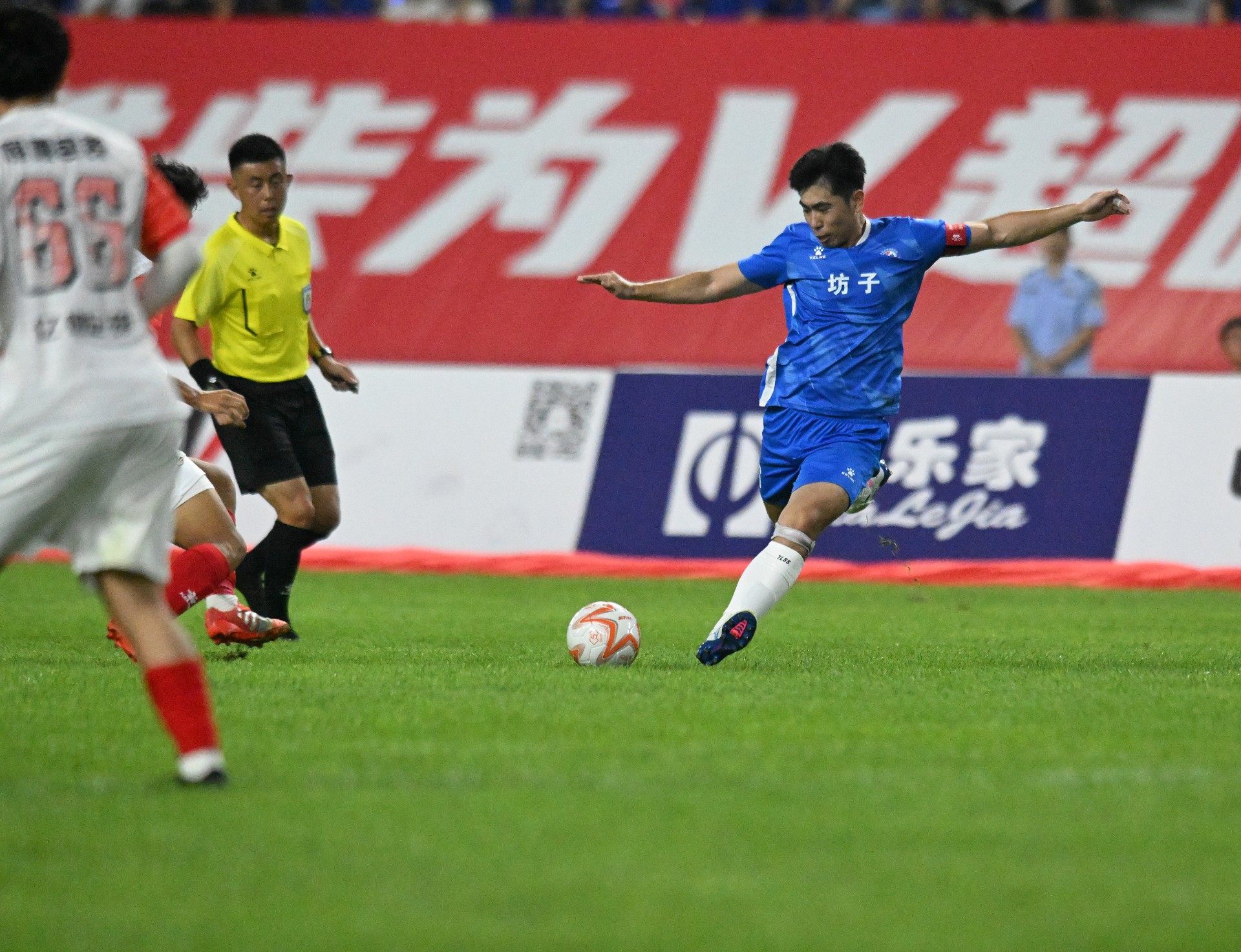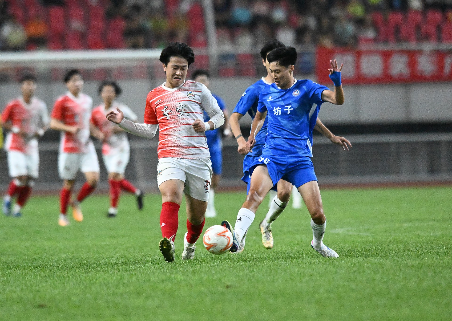 “v超”决赛的两个对手奎文队和坊子队,分别在半决赛战胜了高新队和临朐队晋级决赛,奎文队更是在落后两球的不利局面下,连扳两球,最终依靠点球大战淘汰了高新队。决赛上半场开始,两支球队马上展开对攻,坊子队利用两个边路的快速突破多次制造威胁,奎文队则通过精准长传不断打出精彩的进攻配合,然而两队稳固的防守并没有给对手太多可乘之机,上半场两队0:0战平。