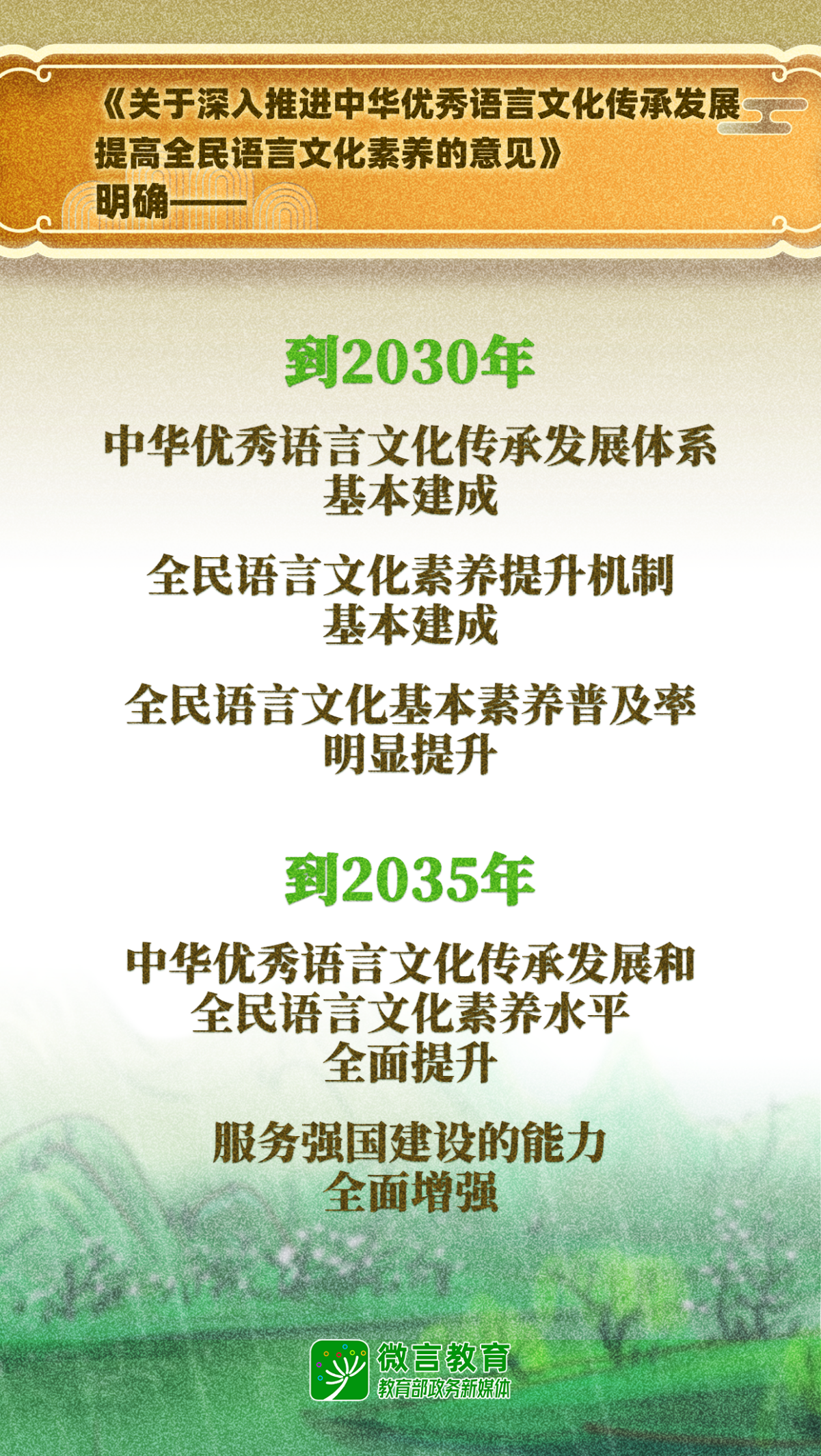 《意见》旨在推动中华优秀语言文化创造性转化和创新性发展,持续提升全民特别是青少年的语言文化素养,助力培养担当民族复兴大任的时代新人,奠基国家语言能力建设,服务铸牢中华民族共同体意识,服务推动构建人类命运共同体,为建设教育强国、文化强国和人才强国提供有力支撑。