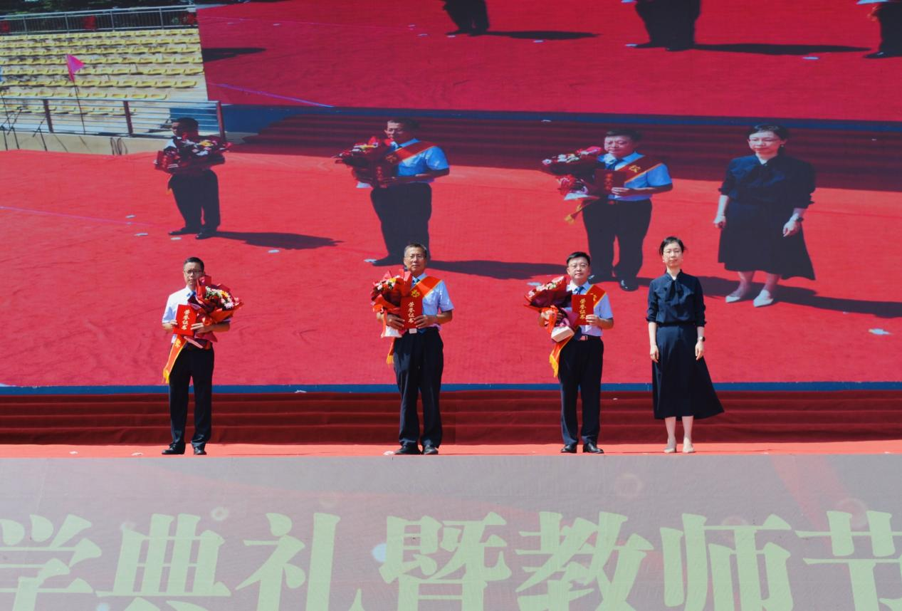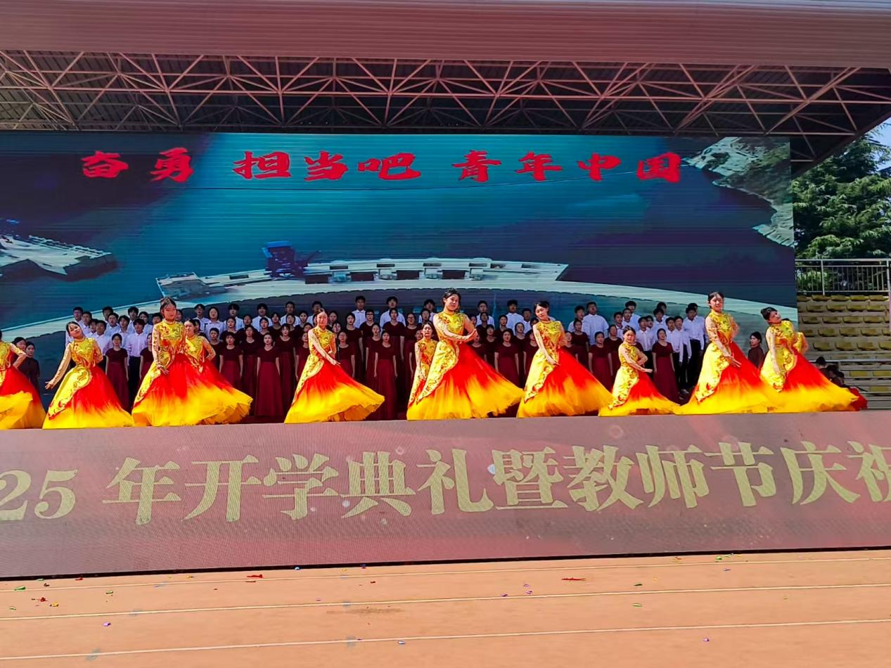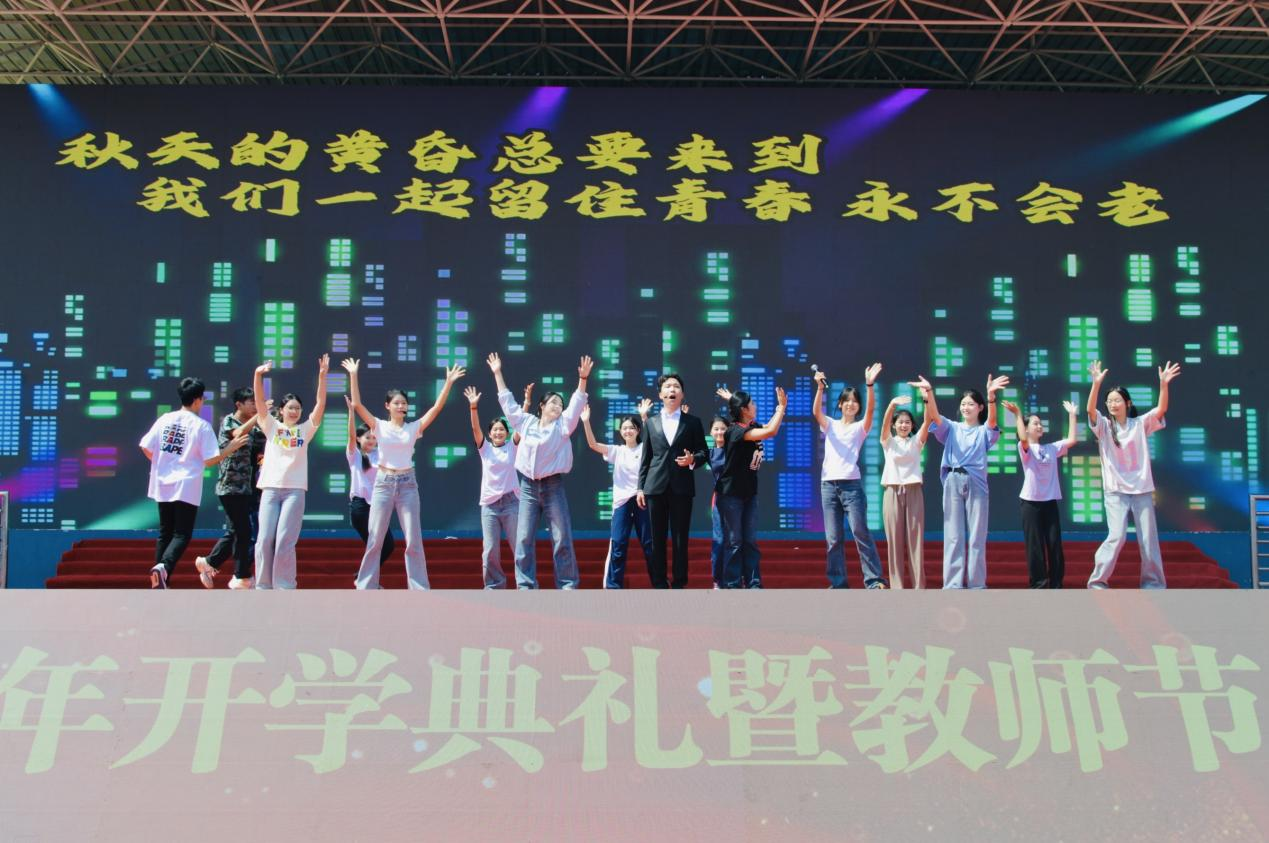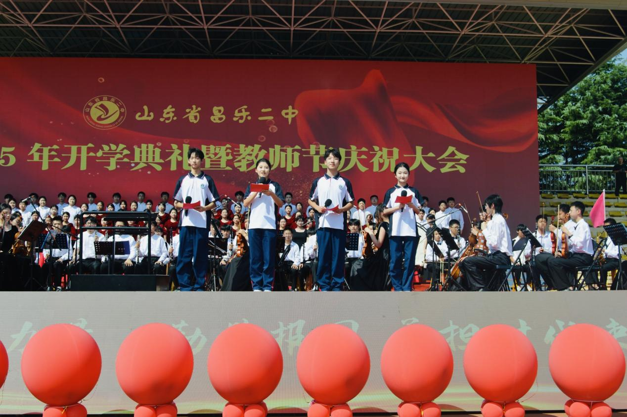 演出结束后,师生宣誓环节点燃全场热情。教师代表郑泽军带领全体教师庄严宣誓,承诺坚守育人使命;学生代表张博智带领全体同学宣誓,立下“勤学报国”的青春誓言。随后,全场共同唱响校歌《让理想插上翅膀》,歌声中承载着师生对未来的憧憬。“新的征程,新的起航!”伴随着主持人的结束语,山东省昌乐二中2025年秋季开学典礼暨教师节庆祝大会圆满落幕。
