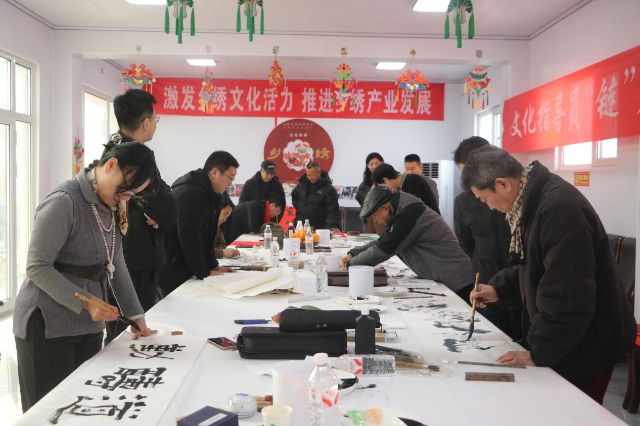 活动现场,书画家们现场展纸挥毫,一幅幅生动的水墨画作、一幅幅笔力遒劲的书法作品在村民眼前渐渐呈现。这种零距离的展示与交流打破了艺术与日常生活的隔阂,让村民们亲眼见证到艺术创作的全过程,感受笔墨之间流淌的文化韵味。同时,书画家们还与现场爱好者分享创作心得,解答他们在书画学习中的疑惑。潍坊市基层文化建设指导员段孝敏说到:“村民都很踊跃,很积极。用书法和绘画来激发当地乡绣文化活力,推进乡绣产业发展贡献我们一些文化的力量。”