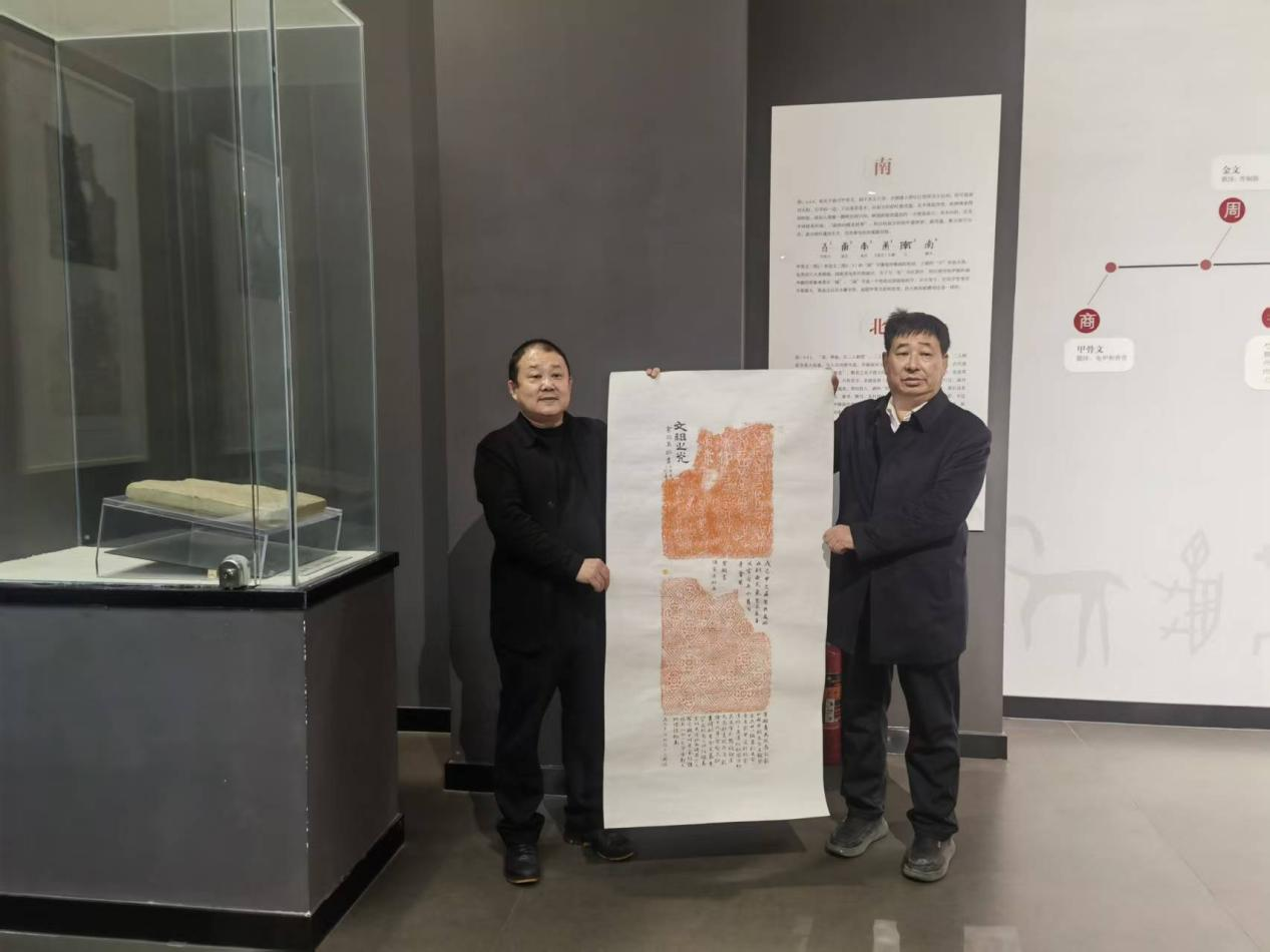送福活动结束后,逄春伟老师还深入屯田西村的汉砖雕刻、金石篆刻、非遗文创展区,结合自身专业知识,为展区的规划布局、文创产品开发提出了专业化建议。同时,他还向仓颉汉字艺术馆捐赠了自己创作的仓颉鸟迹文拓片及书法书籍,助力当地挖掘文化资源、打造文化品牌,推动“文化 产业”深度融合,让传统文化在基层焕发新的生机与活力。