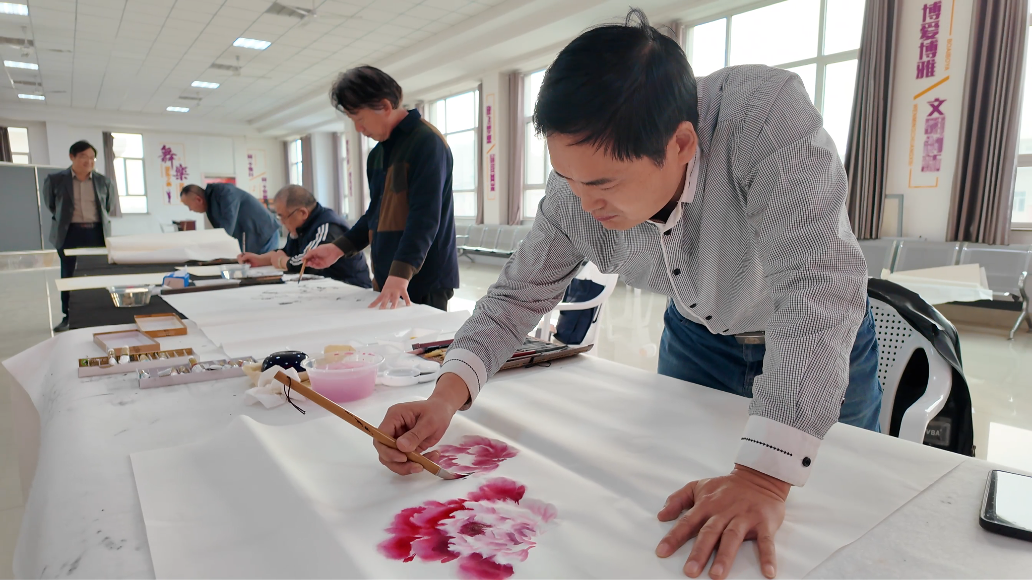 教学现场气氛热烈,居民们或凝神聆听讲解,或认真执笔练习,或互相交流心得。书画家们不仅传授绘画技法,更注重讲解作品背后的文化内涵。李胜彬在指导时强调:“中国画讲究‘意在笔先’,我们不仅要学习技法,更要理解其中蕴含的文化精神。”