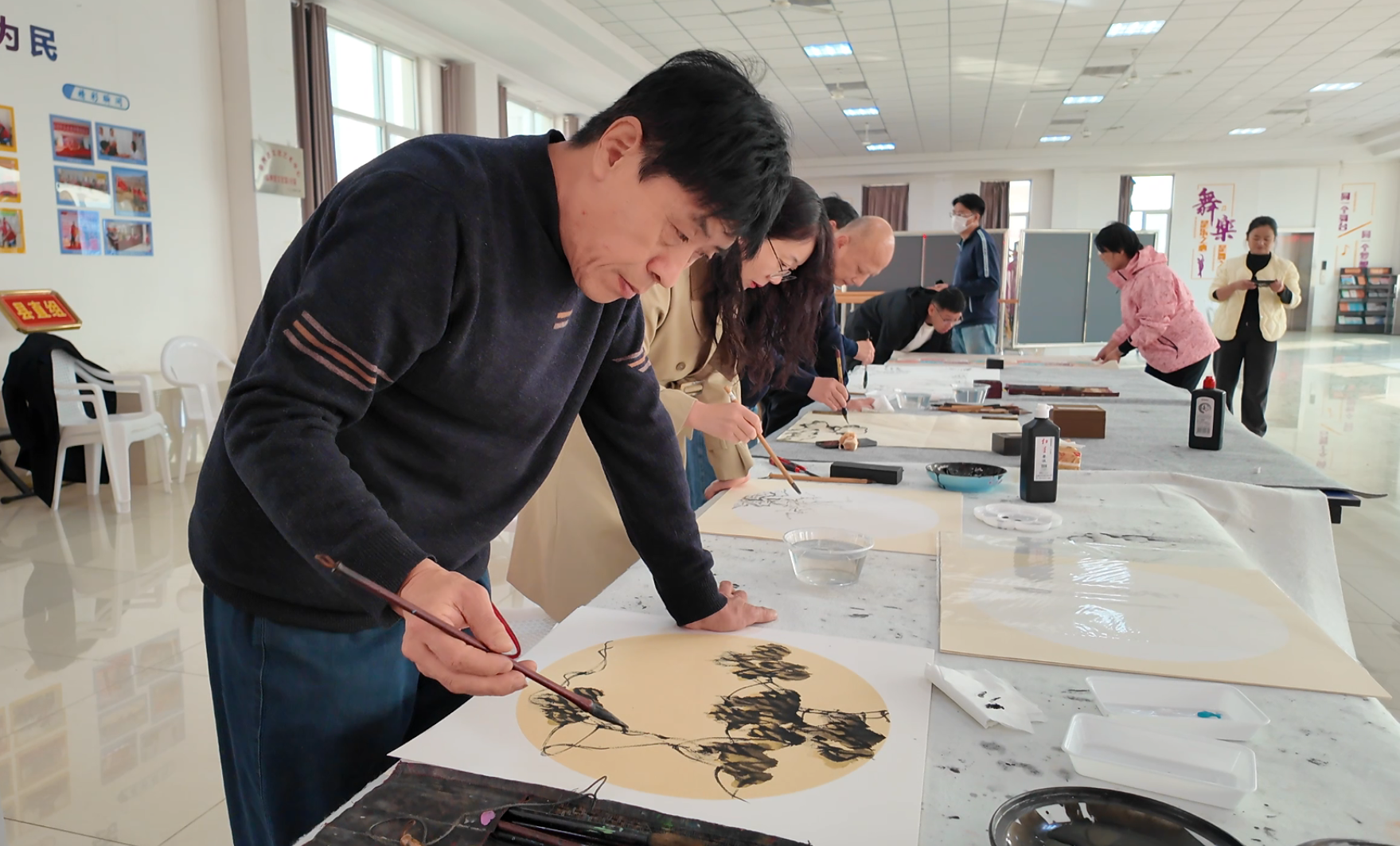 一砚一感知风雅,一笔一画传递祝福。中国美协会员、山东画院高级画师、北京首都画院专职画家,临朐县美协主席李胜彬带队,到城关街道兴隆社区开展文化指导工作,并为社区送上文化祝福。在创作现场,老师们不再仅仅是文化指导者,更是化身为艺术演绎者,他们全神贯注,时而泼墨写意,时而细笔勾勒,随着笔锋流转,富贵牡丹、金黄南瓜、写意花鸟等寓意美好的画作跃然纸上;也让居民近距离感受国画从无到有的完整过程,真切体会水墨丹青的意境之美与创作之乐。
