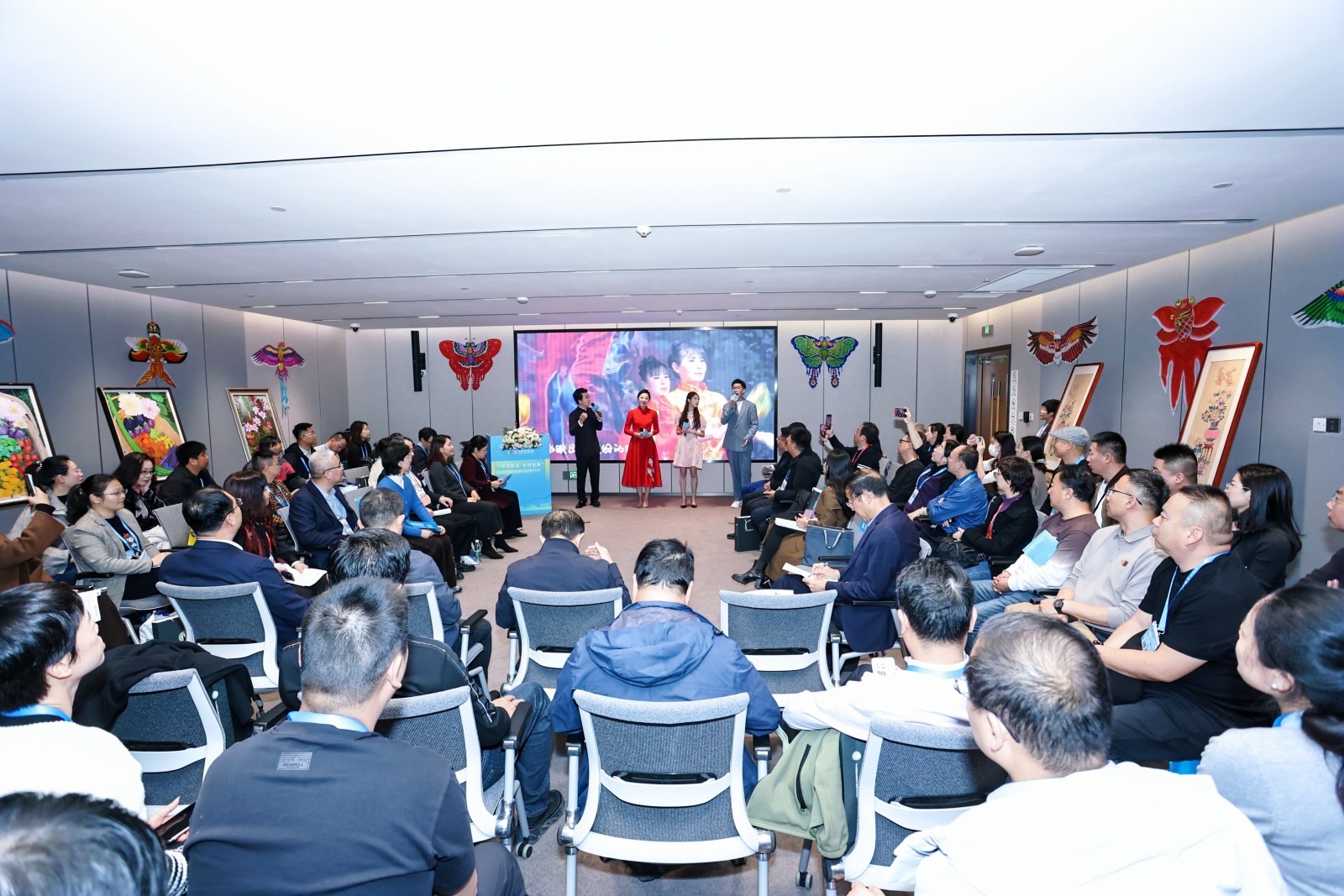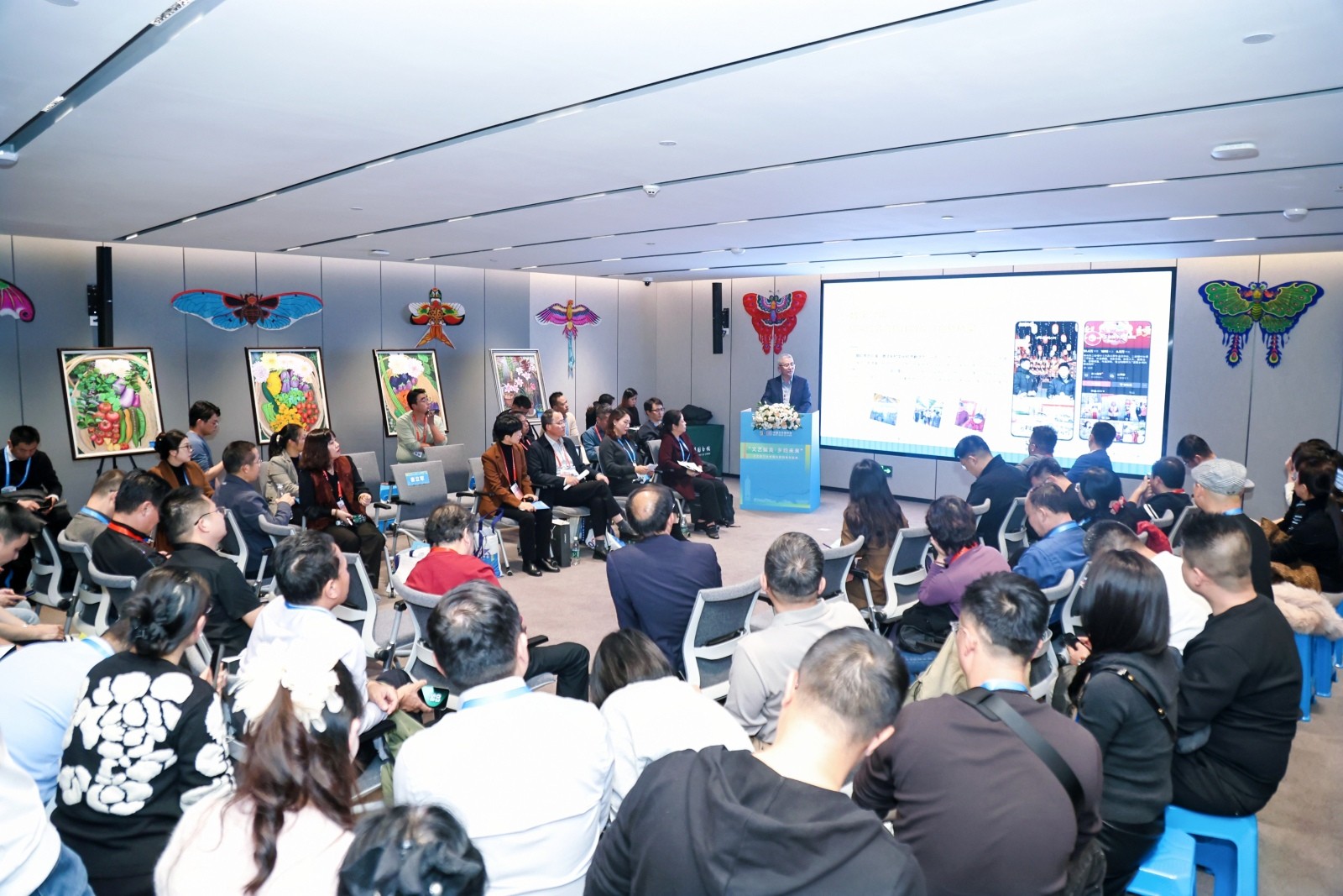 活动突破了传统会议形式,采用案例分享和文艺表演交替登场的方式,使实践成果可听可感。活动期间,潍坊演员表演的对口快板《喇叭花》、独舞《故乡的天空》等文艺节目精彩上演,用艺术语言讲述乡土故事,为交流活动增添了浓厚的艺术氛围。中央民族乐团青年女高音唐文娟在现场献唱《纳西情歌》,用歌声传递文化共鸣。这些表演与案例交流内容相互呼应,展现了文艺激活乡村活力的实践成果。活动现场处处彰显“乡村韵味”与“文艺气息”。“潍有尚品”乡村好物展销区人头攒动,展柜、展台上陈列的潍坊乡村特色非遗产品、手工艺品,如剪纸、刺绣等,凭借独特的地域文化内涵吸引参会者驻足观赏、咨询交流,成为宣传潍坊乡村文化的生动窗口;会场墙面悬挂的潍坊农民画、新年画,以鲜艳的色彩、质朴的笔触描绘出乡村丰收场景、民俗活动、田园风光,让参会者直观感受乡村生活的美好与活力,营造出浓厚的乡村文化氛围。
