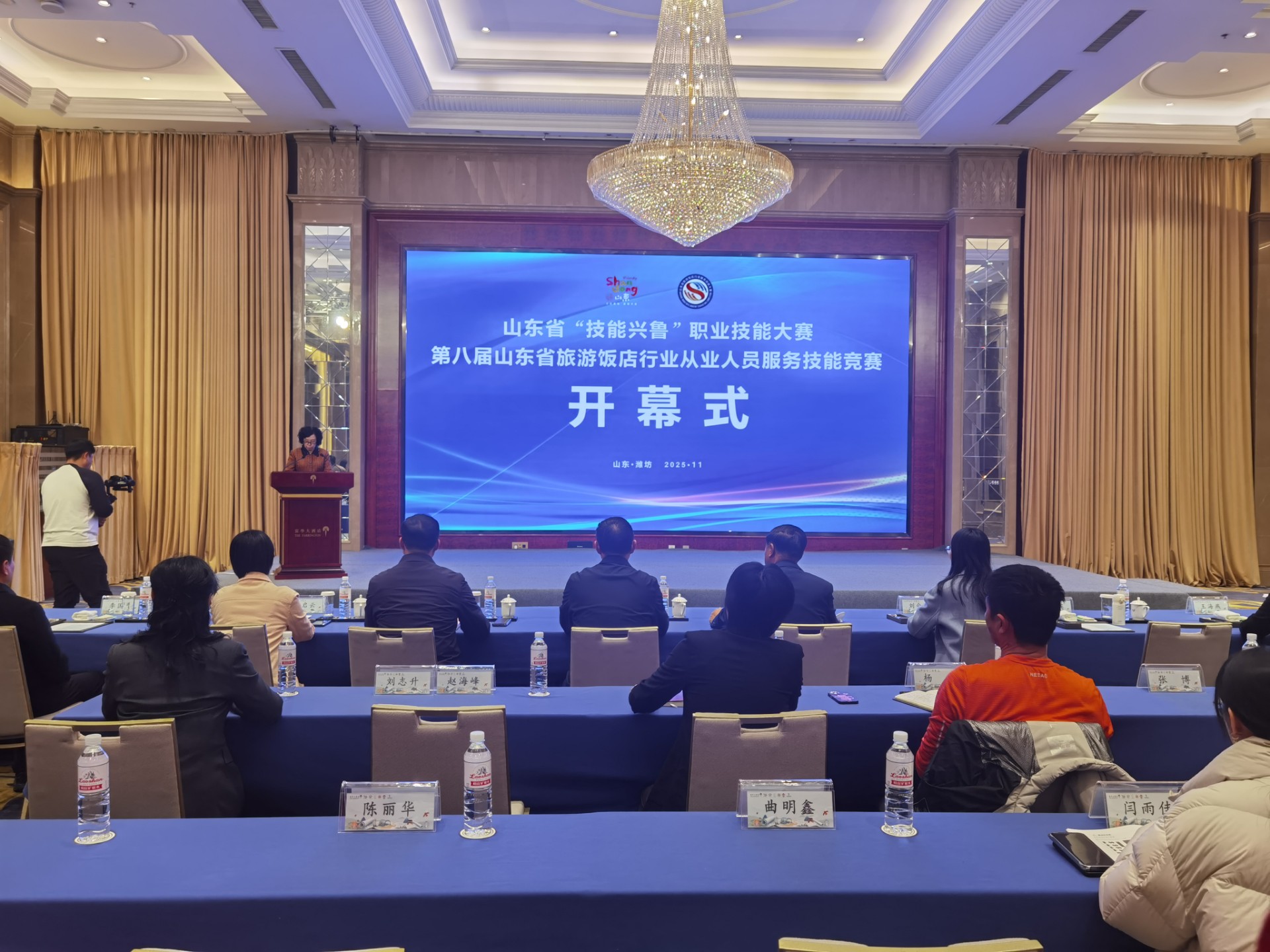 速豹新闻网苗露 肖莹坤潍坊报道:11月19日,山东省“技能兴鲁”职业技能大赛——第八届山东省旅游饭店行业从业人员服务技能竞赛决赛在潍坊富华大酒店隆重开幕。