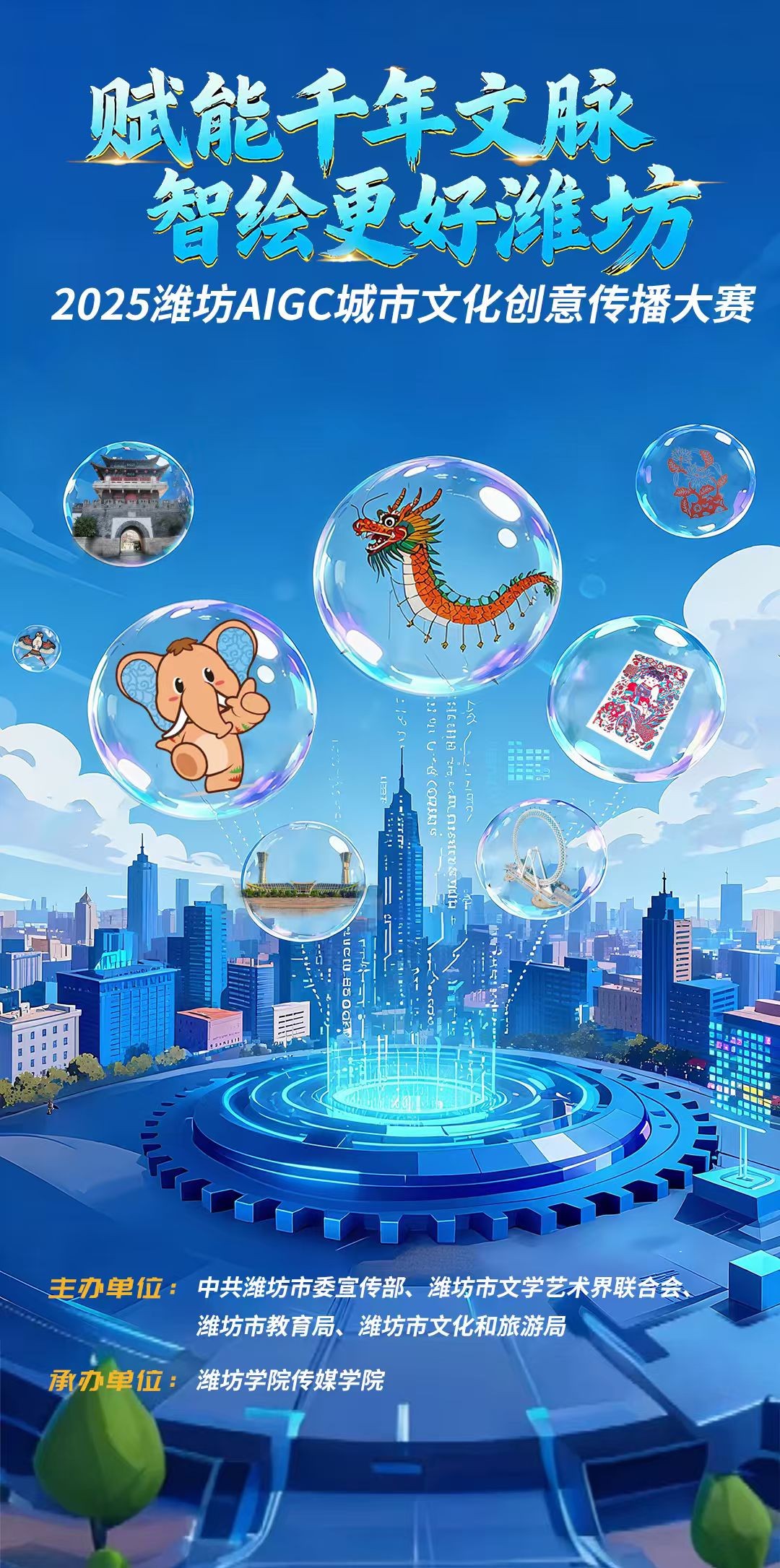 答案,由你定义!由中共潍坊市委宣传部、潍坊市文学艺术界联合会、潍坊市教育局、潍坊市文化和旅游局主办,潍坊学院传媒学院承办的2025潍坊aigc城市文化创意大赛正式启动!诚挚邀请您用精彩文化创意,加上ai挥毫助力,智绘世界风筝都、国际和平城市、世界手工艺与民间艺术之都、东亚文化之都、中国画都、金石之都......一座文化宝藏城市——更好潍坊的“潍”美画卷。
